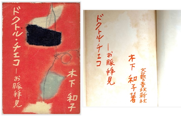 New ドクトル・チエコ お脈拝見 木下和子著 佐野繁次郎装幀 文藝春秋 昭和29年 初版 状態 ビニカバ欠 ヤケシミスレ order number: 007-K024 price: \800- 性医学評論で人気な産婦人科医ドクトル・チエコが、一般からのさまざまな疑問に応えていきます。著作者の木下和子は、ドクトル・チエコの本名です。 装幀は布によるパピエコレか。表紙の朱に描き文字が、扉では反転し朱の描き文字になっていてステキです。 |