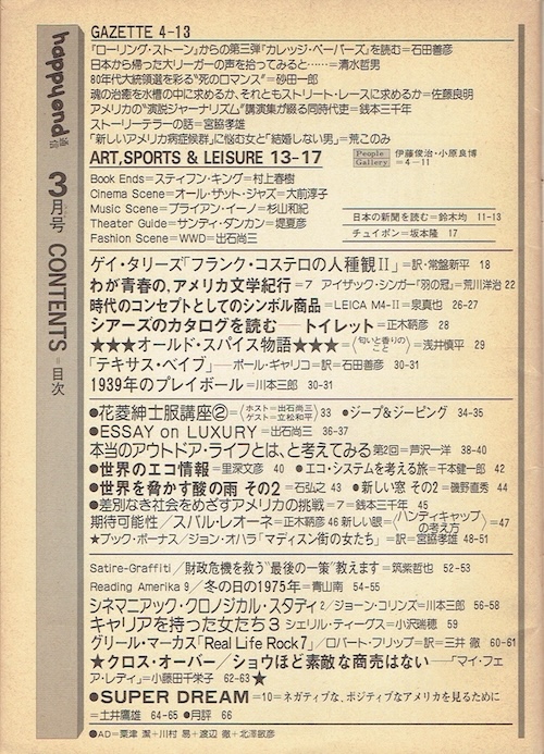 NEW happy end 通信 1980/3 ハッピーエンド通信社 状態 経年劣化 order number: Hpe80_3 price: \1,500- ゲイ・タリーズ [フランク・コステロの人種観] わが青春のアメリカ文学紀行=アイザック・シンガー「羽の冠」 荒川洋治 ジョン・オハラ「マディソン街の女たち」 グリール・マーカス「リアル・ライフ・ロック」=ロバート・フリップ Movie review "HAIR" 時代のエクスタシーを表現する「解放の神話」 他 目次を見る→